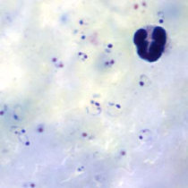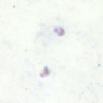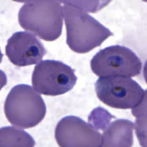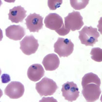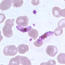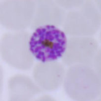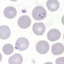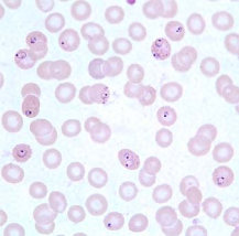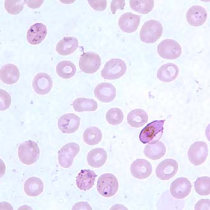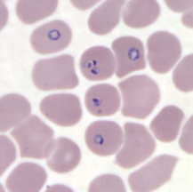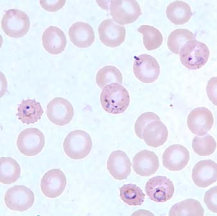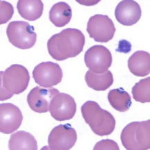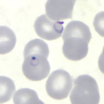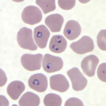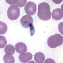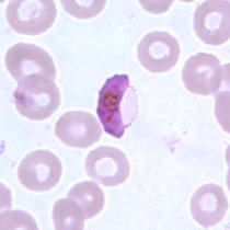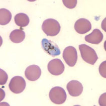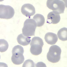 در عفونتهای ناشی از پلاسمودیوم فالسیپاریوم، گلبولهای قرمز اندازهای طبیعی دارند. معمولا فقط فرمهای حلقوی و گامتوسیتهایشان دیده میشود، مگر اینکه خون قبل از تهیه اسمیر برای مدتی مانده باشد.