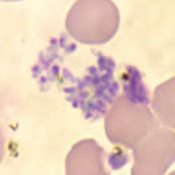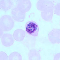 شیزونتهای پلاسمودیوم فالسیپاریوم به ندرت در خون محیطی دیده میشوند. شیزونتهای بالغ دارای 8 الی 24 مروزوئیت کوچک هستند و رنگدانههای تیره دارند که بصورت یک توده متراکم تجمع یافتهاند.